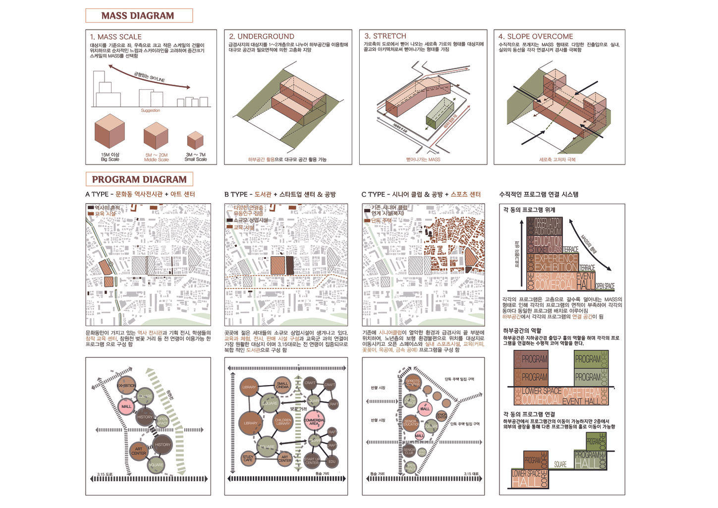 이에 세로축의 가로는 급경사(3.15대로에서부터 대상지 끝까지 10 ~12M)로 이루어져 있다. 이로써 불편한 보행환경이 나타나며, 주변에 활용 가능한 요소가 있지만 활성화가 낮으며 도시 곳곳에 휴게공간, 오픈스페이스가 부족하다. 연결하는 세로축의 가로체계를 정비하고 도시가 지니고 있는 잠재력의 요소를 활용하여 프로그램을 형성하여 도시 내부에서 주변과의 소통이 가능할 것으로 보인다.